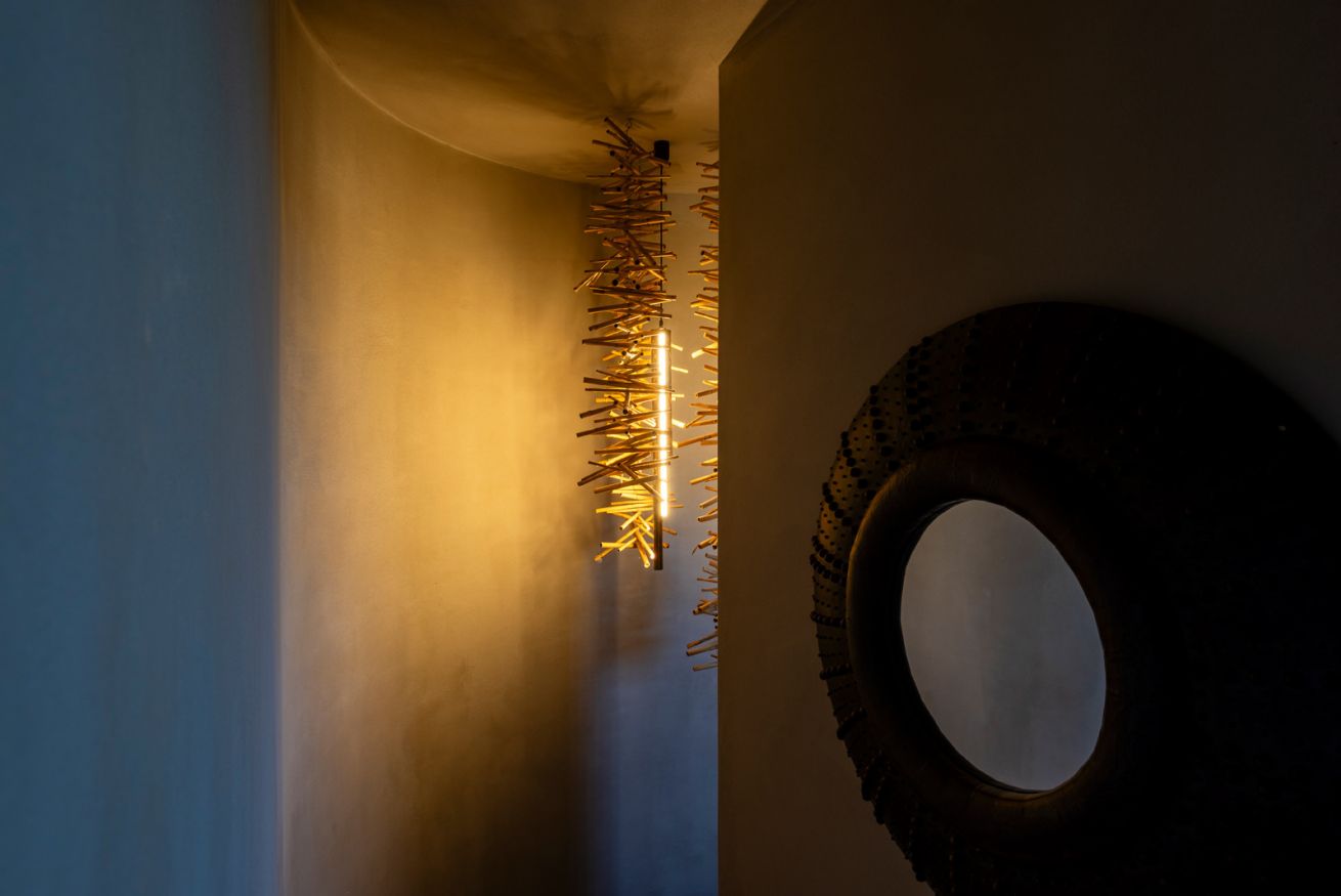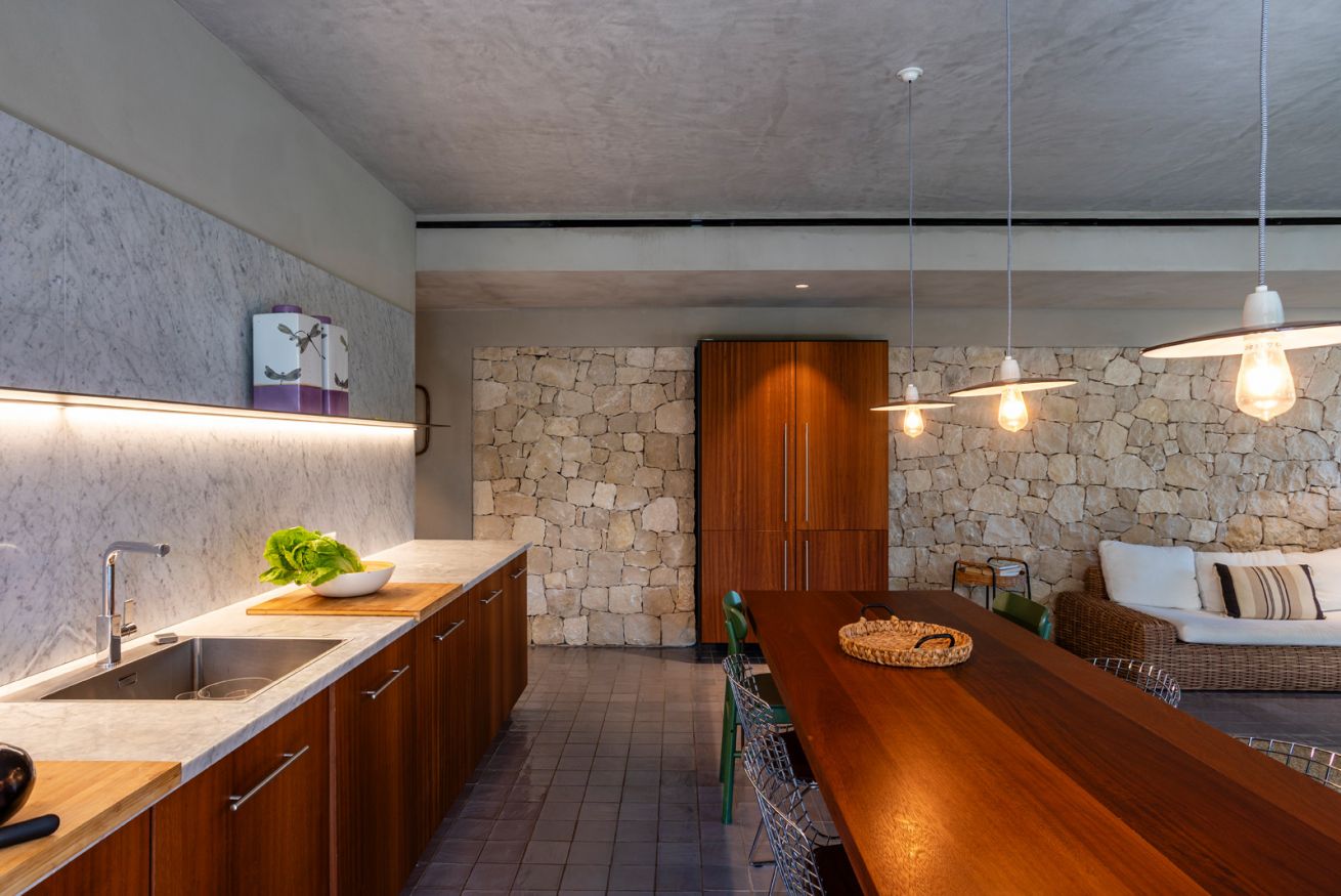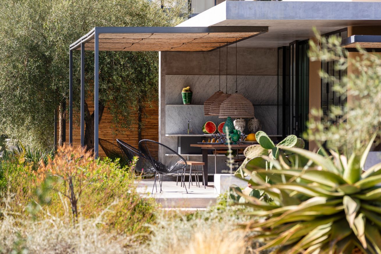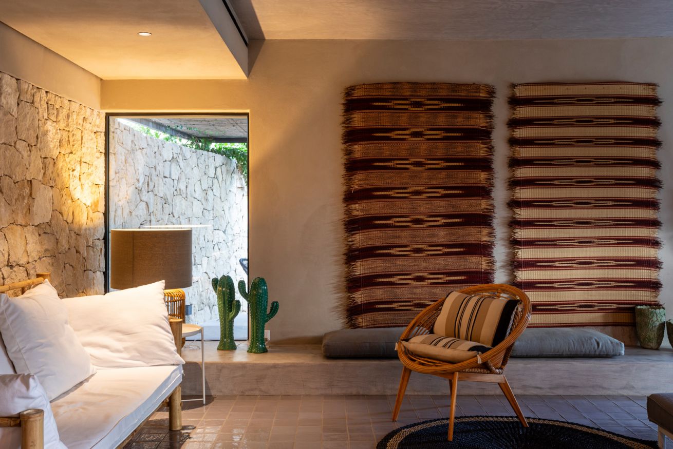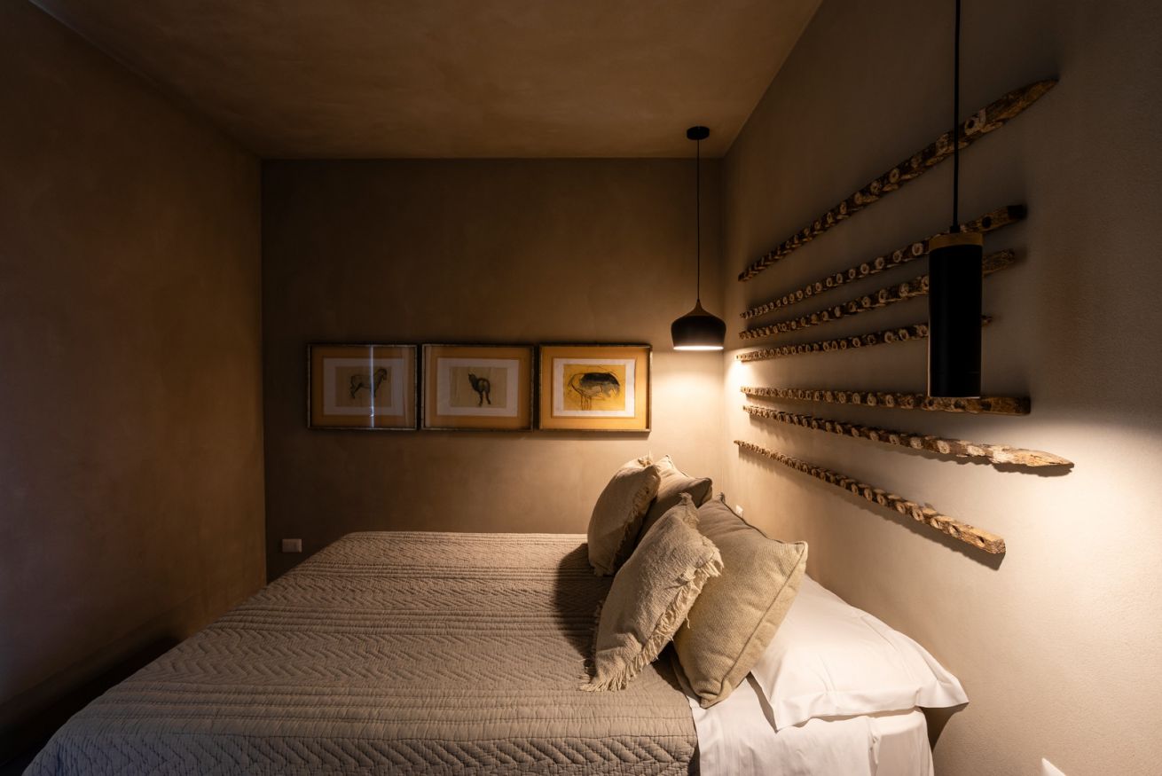 L’arredamento combina legno naturale, rattan e toni della terra. Arazzi etnici e dettagli in marmo e piastrelle lucide conferiscono carattere e autenticità.