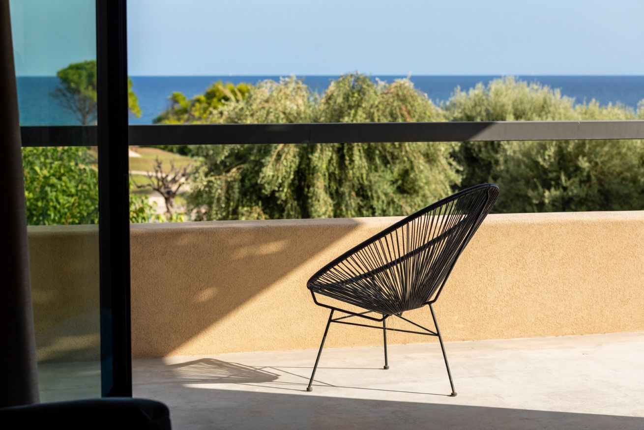 Una camera con vista mare, bagno privato e accesso a una terrazza che si sviluppa su due lati della villa.