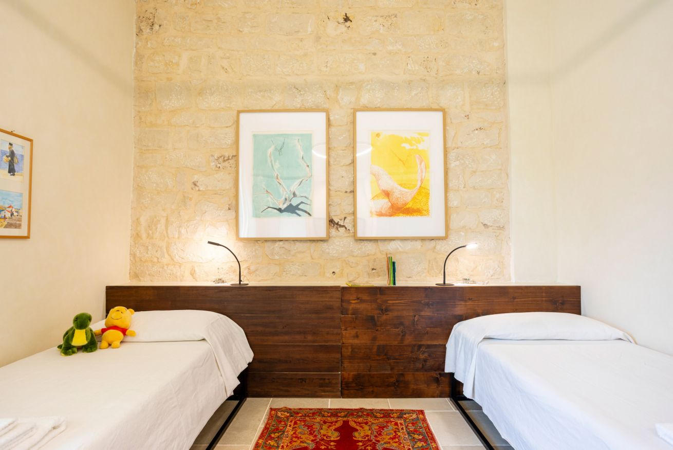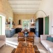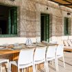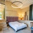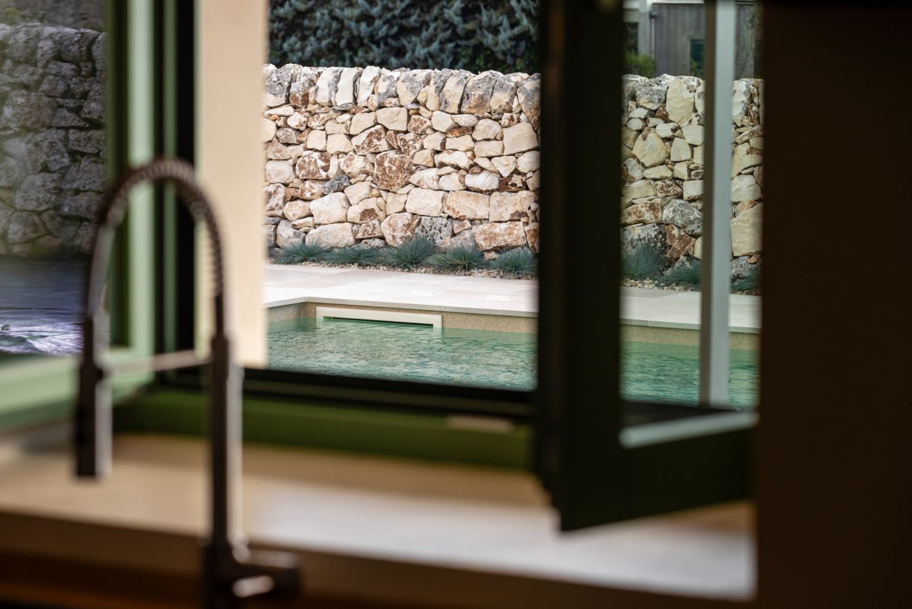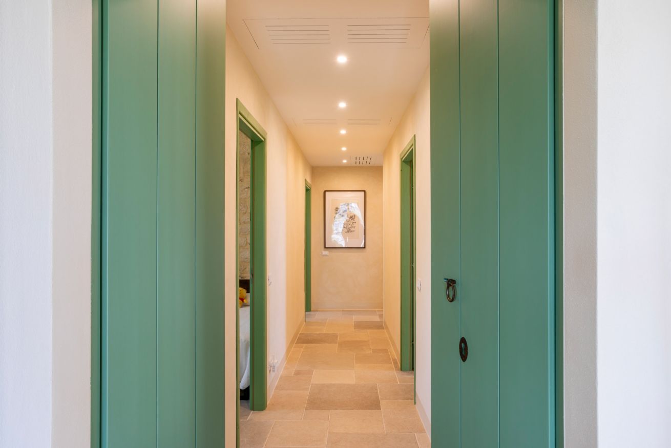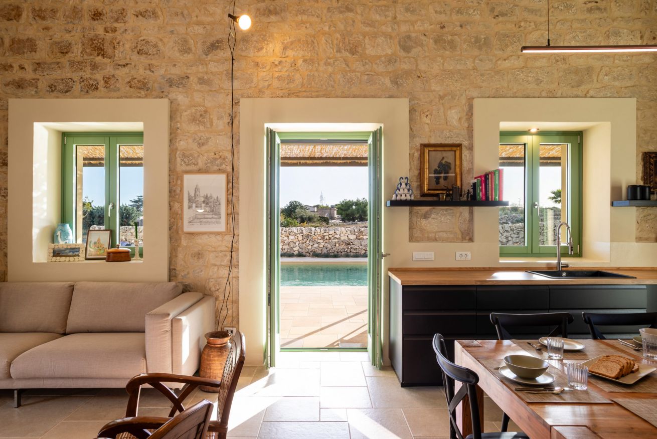 pareti in pietra e materiali naturali, arredi essenziali e accoglienti, ambienti luminosi grazie alle ampie aperture verso il patio e la piscina La zona living unisce convivialità e comfort, mentre le 5 camere e i 4 bagni offrono privacy e tranquillità, perfette per un soggiorno rigenerante.