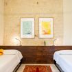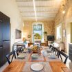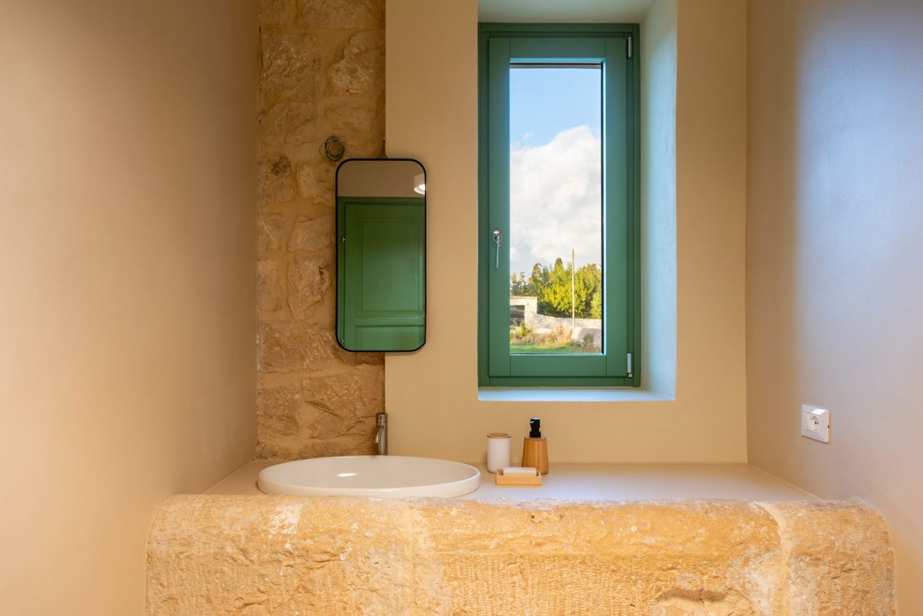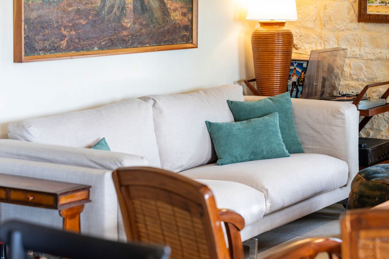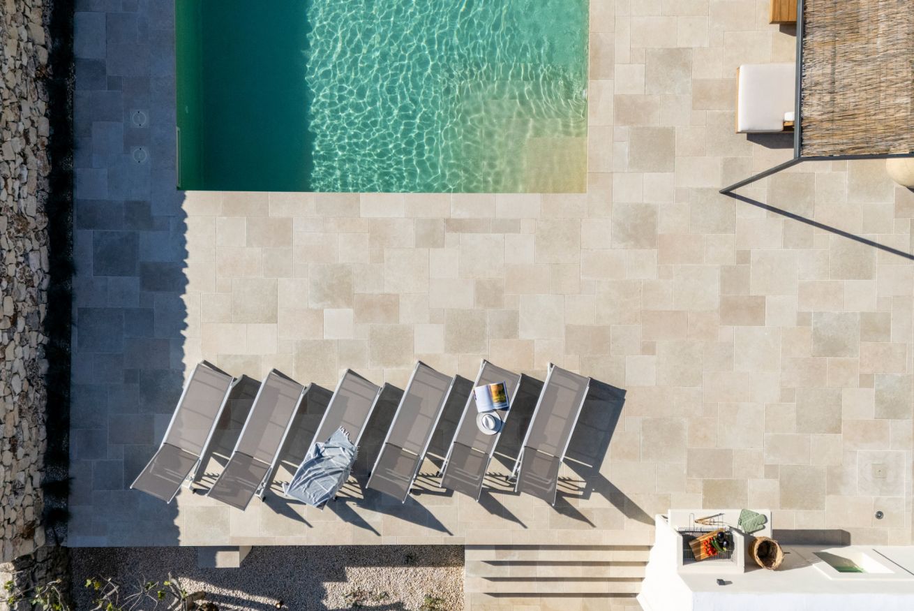 pareti in pietra e materiali naturali, arredi essenziali e accoglienti, ambienti luminosi grazie alle ampie aperture verso il patio e la piscina La zona living unisce convivialità e comfort, mentre le 5 camere e i 4 bagni offrono privacy e tranquillità, perfette per un soggiorno rigenerante.