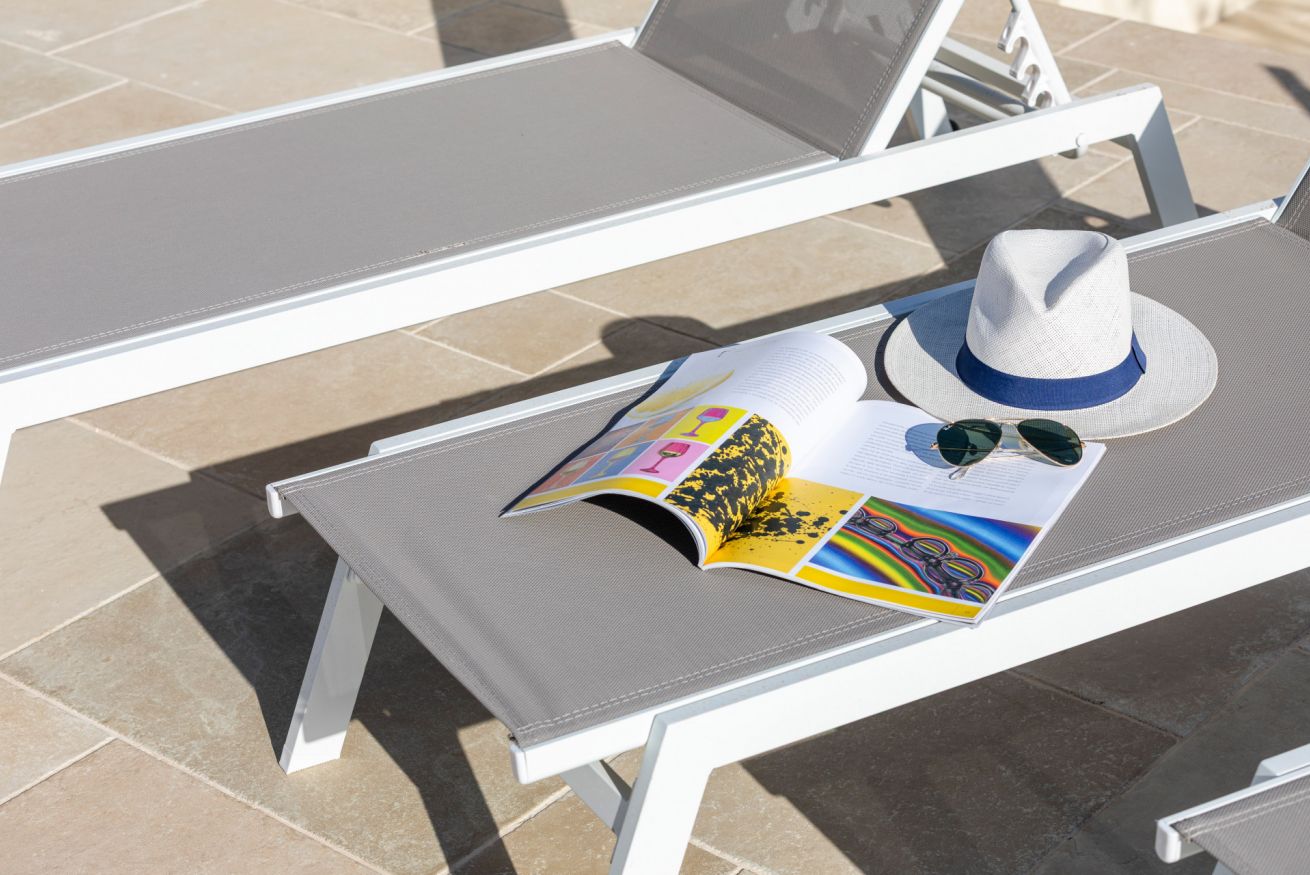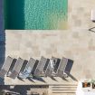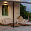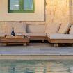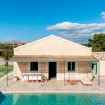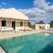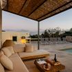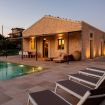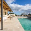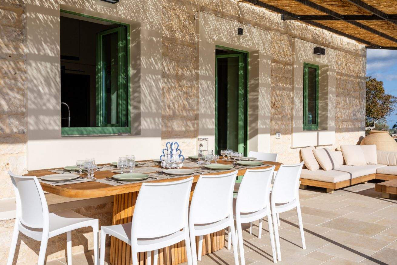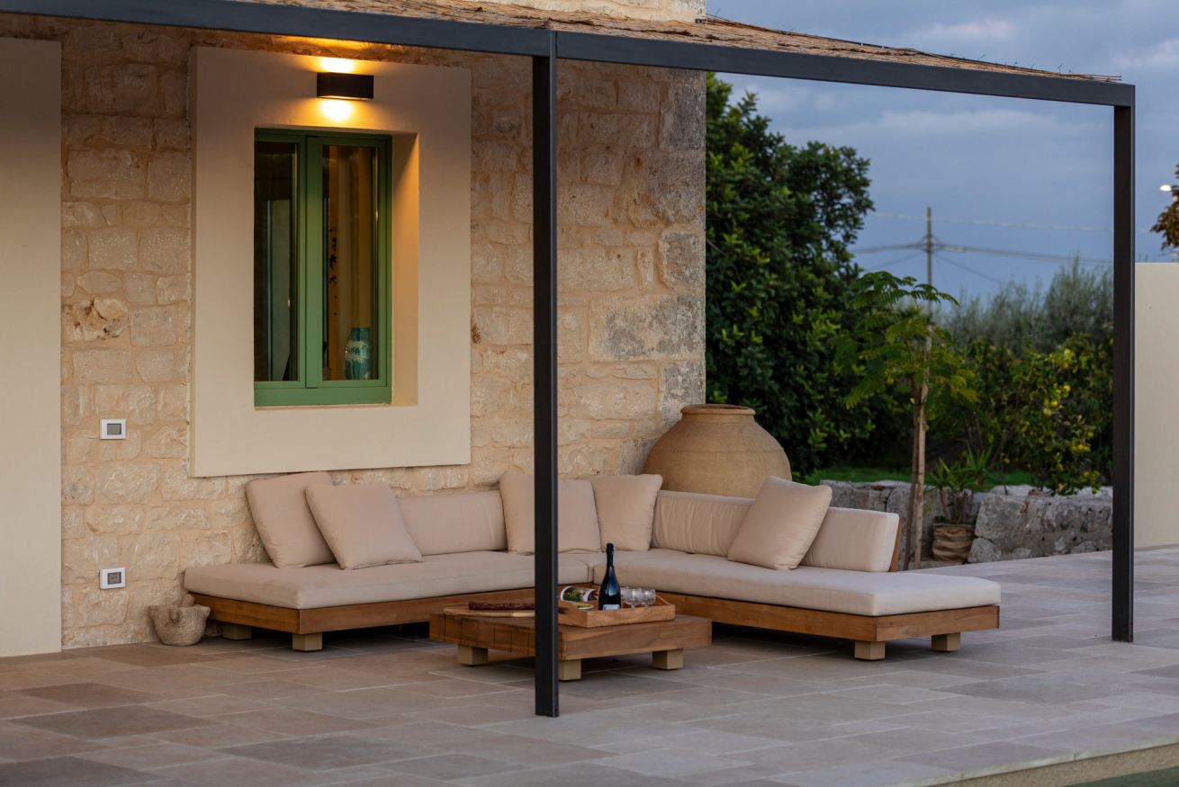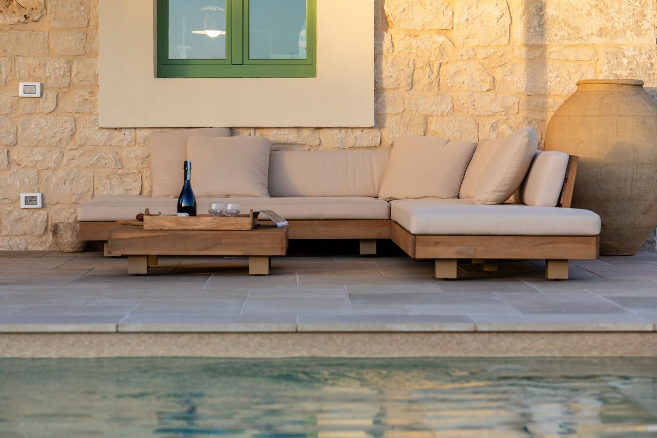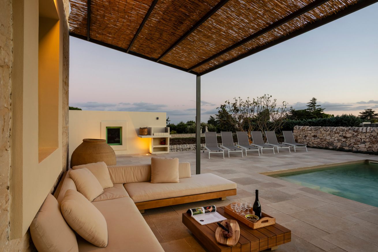 La villa si apre su un ampio patio con pergolato, arredato con comodi divani e una grande tavolata ideale per pranzi all’aperto. La protagonista è la piscina privata, elegante e illuminata, perfetta per un tuffo al tramonto o per rilassarsi nelle ore più calde della giornata. A bordo piscina, lettini e aree lounge garantiscono uno spazio esclusivo per riposo e convivialità.