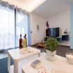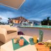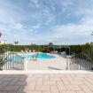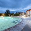 Dalla zona giorno, attraverso una veranda attrezzata, si accede al giardino, al centro del quale si trova una splendida piscina con una piccola spiaggia, un'area per bambini e una zona più profonda attrezzata con un trampolino.