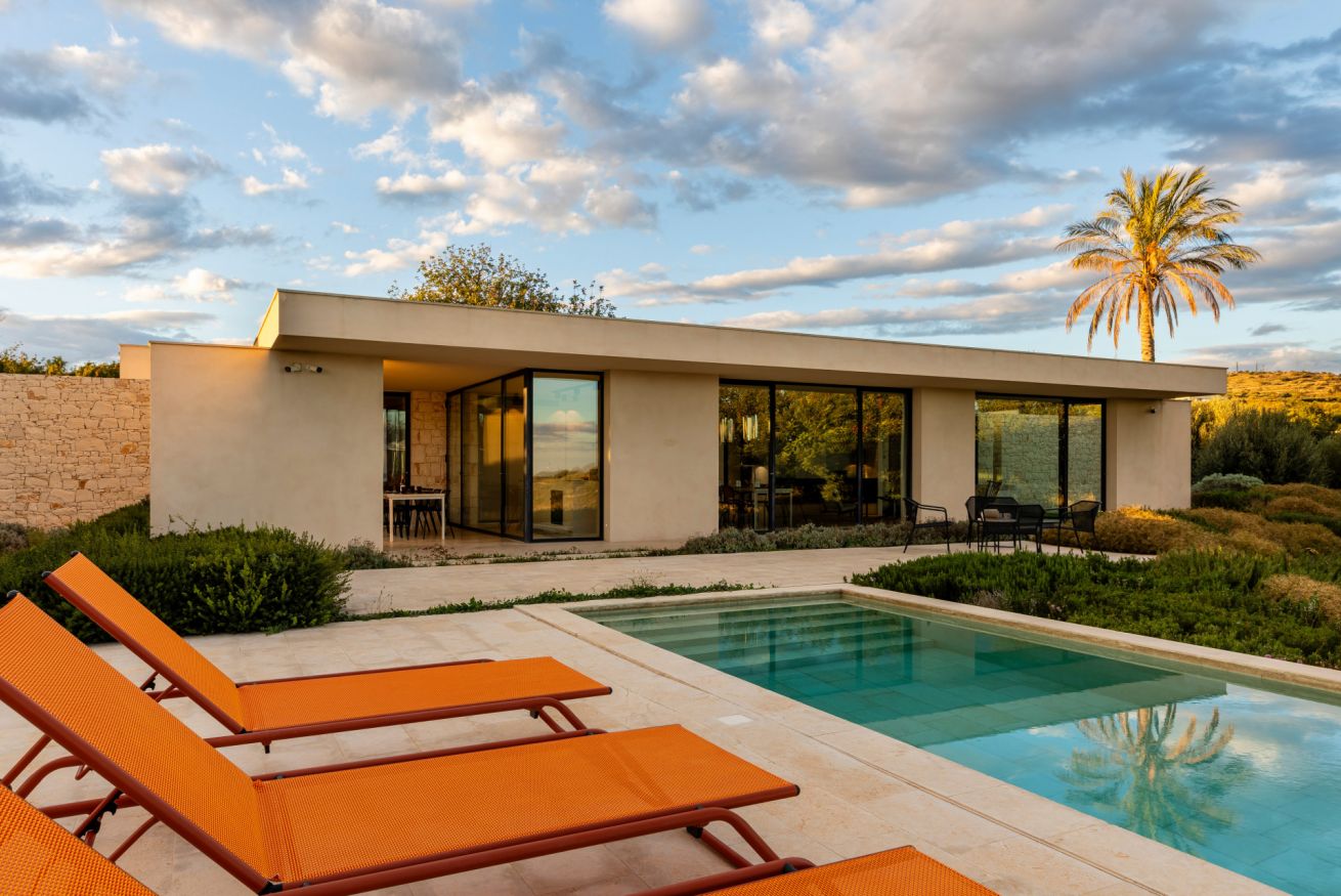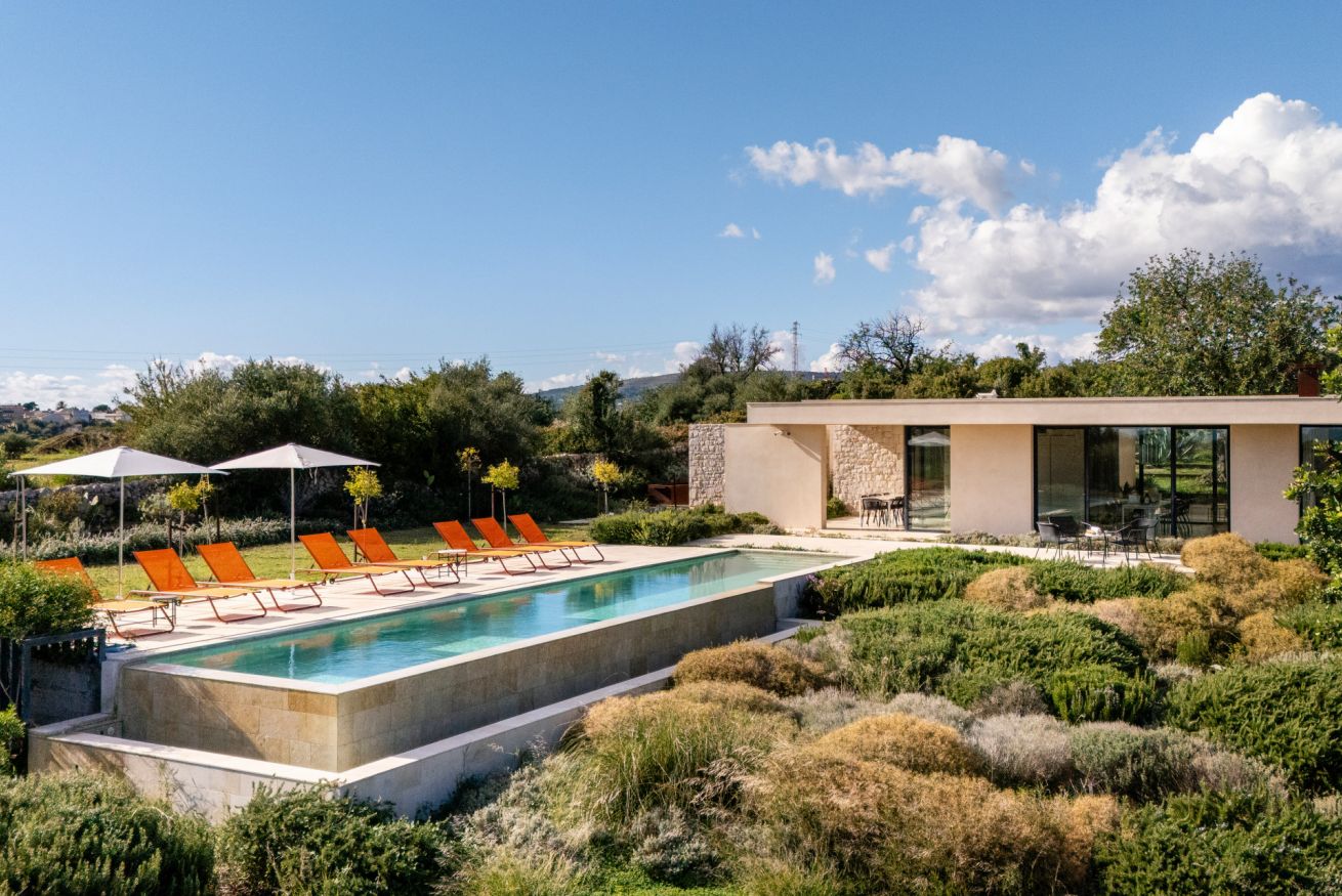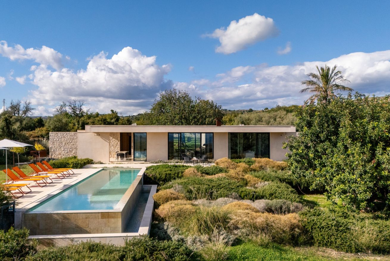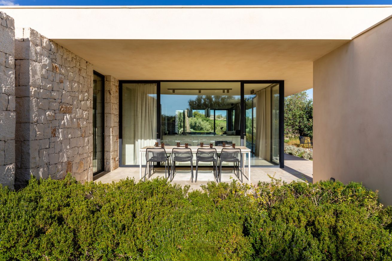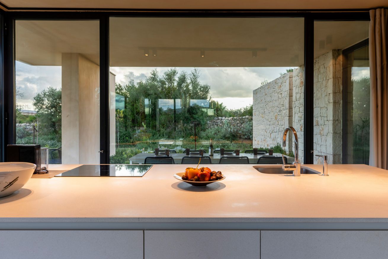 Linee simmetriche degli interni, pietra locale e legno dalle tonalità calde creano un’atmosfera di armonia e luminosità. Le ampie vetrate prolungano il paesaggio all’interno, rendendo il living un’estensione naturale della quiete che circonda questa splendida villa di lusso in affitto a Noto.