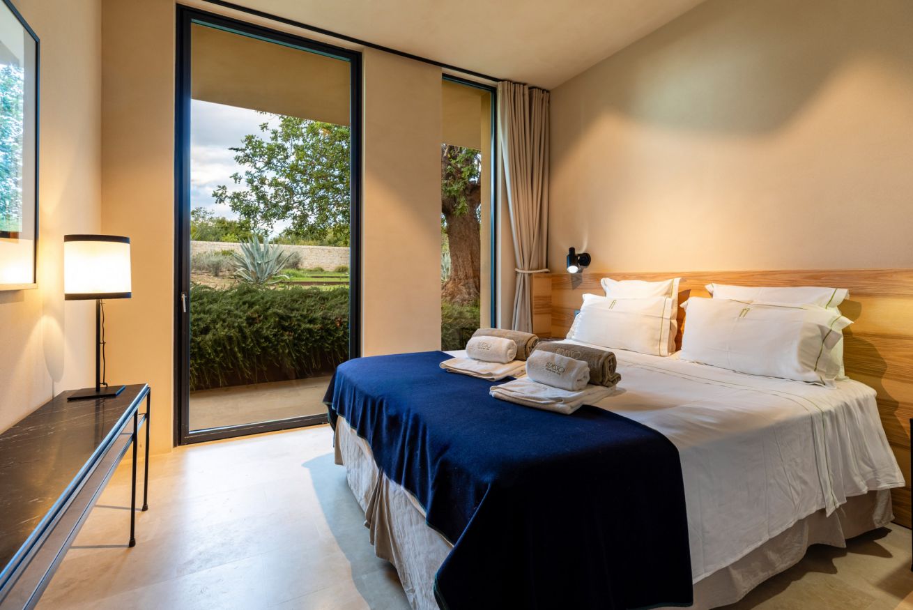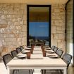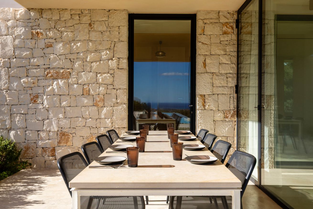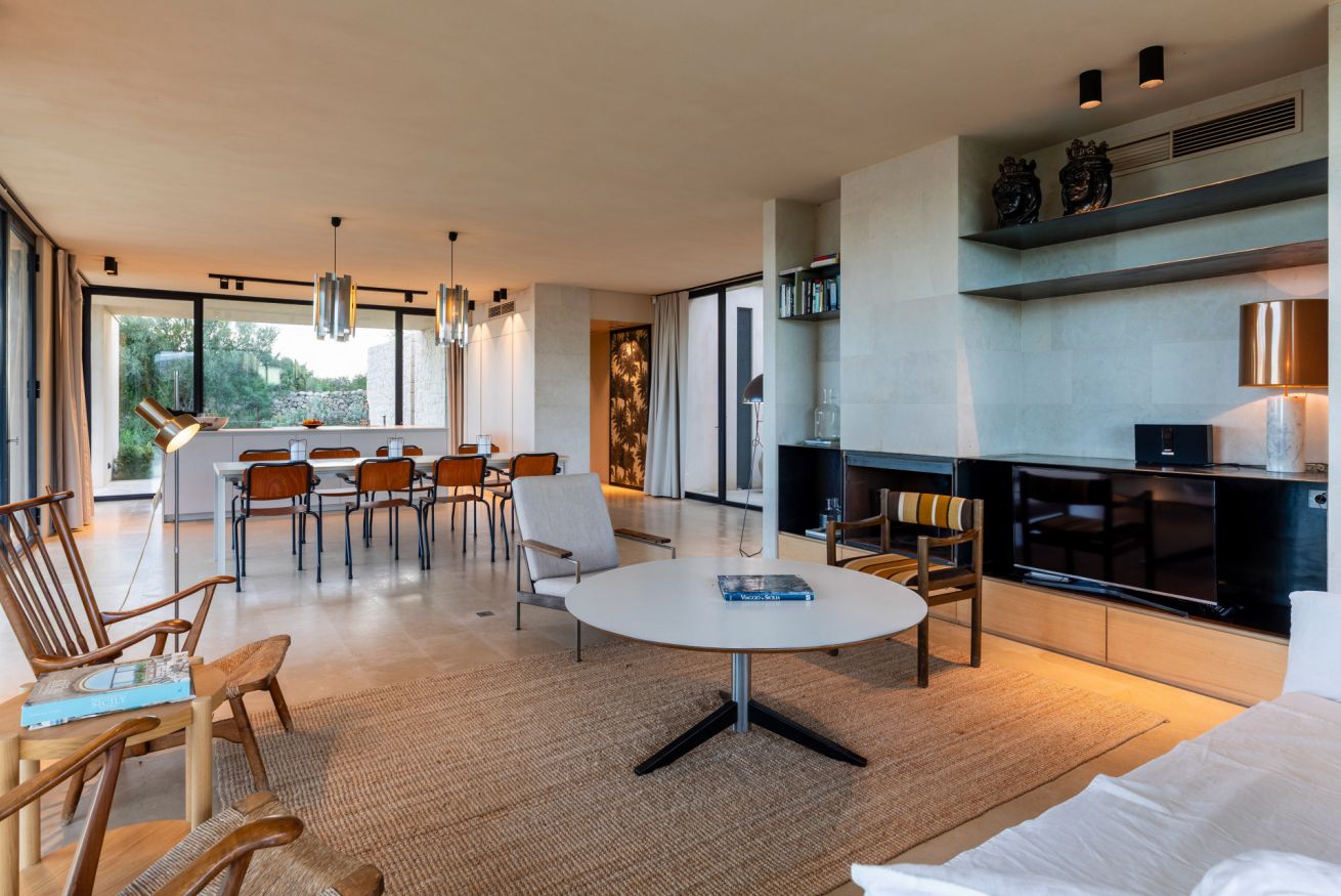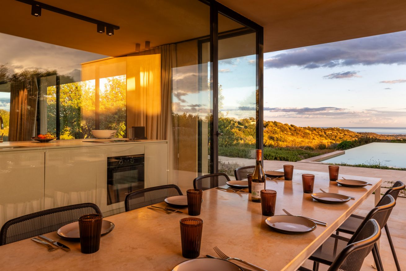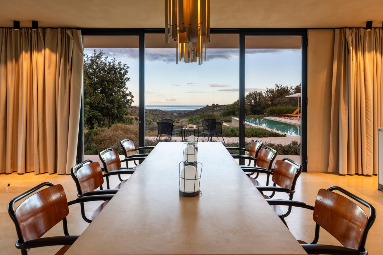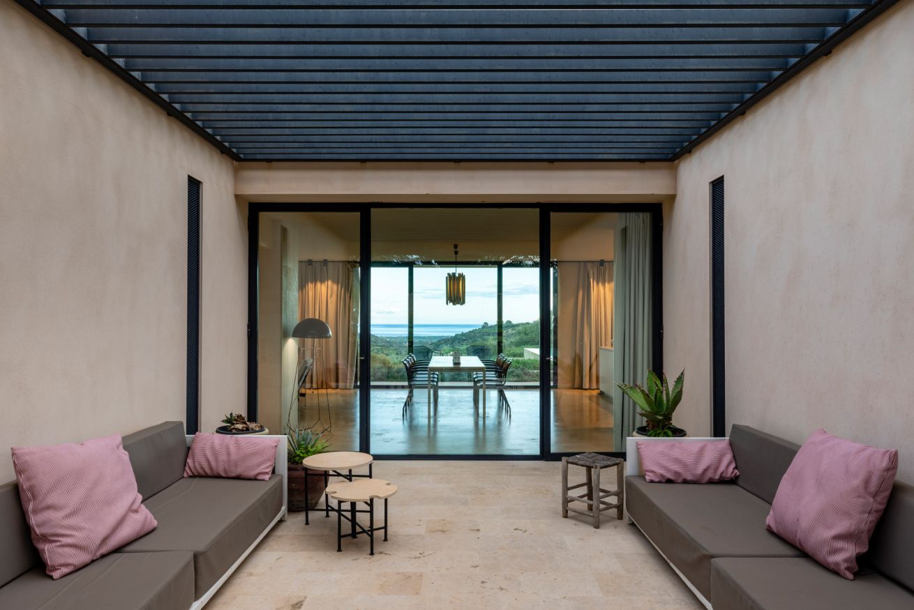 Linee simmetriche degli interni, pietra locale e legno dalle tonalità calde creano un’atmosfera di armonia e luminosità. Le ampie vetrate prolungano il paesaggio all’interno, rendendo il living un’estensione naturale della quiete che circonda questa splendida villa di lusso in affitto a Noto.