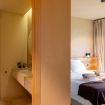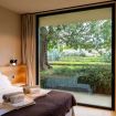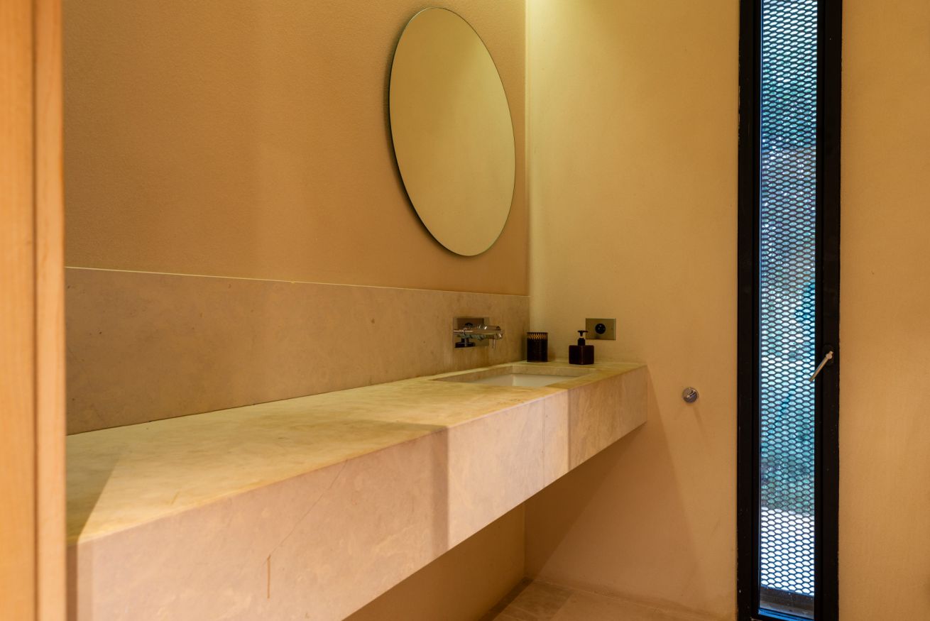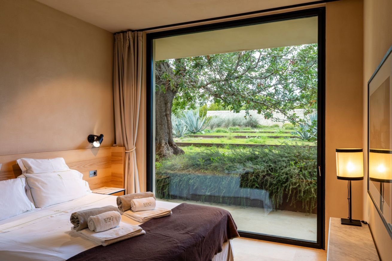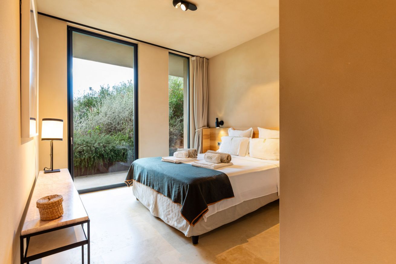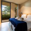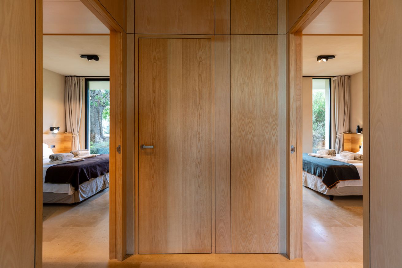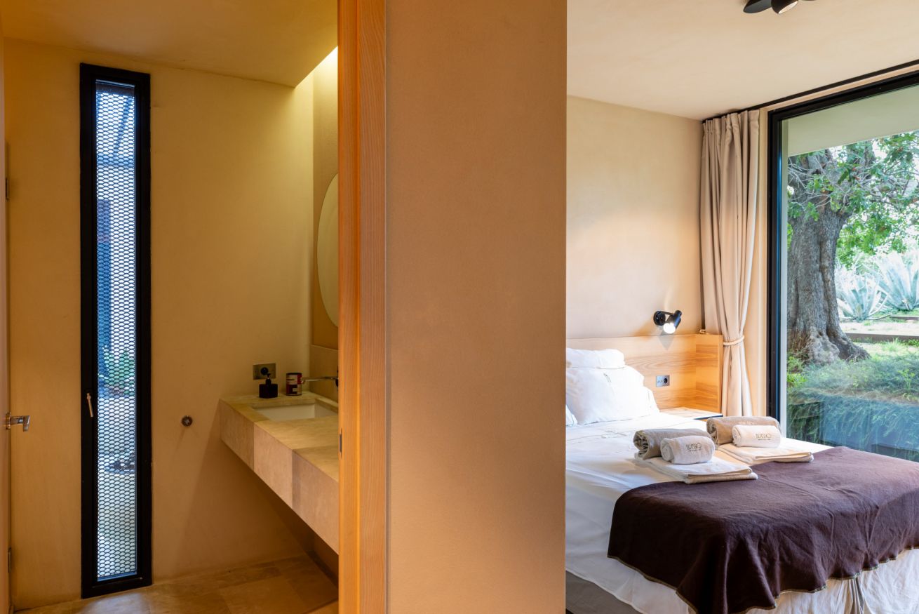 Linee simmetriche degli interni, pietra locale e legno dalle tonalità calde creano un’atmosfera di armonia e luminosità. Le ampie vetrate prolungano il paesaggio all’interno, rendendo il living un’estensione naturale della quiete che circonda questa splendida villa di lusso in affitto a Noto.