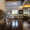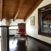 Le due scale che si imboccano dalle zone giorno al pianterreno conducono a due aree separate del primo piano. Sul lato della piscina c'è un soggiorno con soffitto a travi spioventi, divani, scrivania e accesso a una terrazza arredata con vista spettacolare sul giardino e sulla piscina. Uscendo dal soggiorno ci si trova su un ballatoio con pianoforte che si affaccia direttamente sul salone sottostante e che conduce alla zona notte del primo piano. Qui si trovano uno studio e quattro camere da letto (tre doppie e una tripla). La tripla e una delle doppie si affacciano sul cortile e condividono un bagno, mentre delle altre due doppie una dispone di un bagno privato e l'altra ha il proprio bagno accanto.