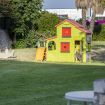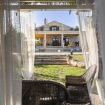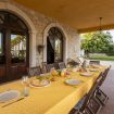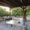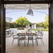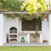 All'ombra di una grande veranda con vista sul giardino trovano posto un tavolo da pranzo e un barbecue mobile.