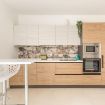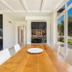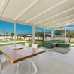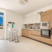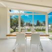 Nel grande soggiorno con tettoia in legno e vetrate che lasciano godere dello splendido panorama, vi sono un grande divano per il relax, la tv e la sala da pranzo. Accanto, la spaziosa cucina ben equipaggiata.