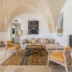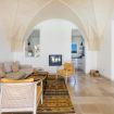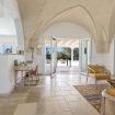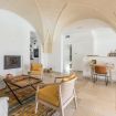 Gli interni sono introdotti da una grande zona giorno composta da un salotto arredato con grande divano ad angolo, caminetto e 1 pouf letto singolo sotto una splendida volta a stella, una sala da pranzo moderna e un cucinino completo.